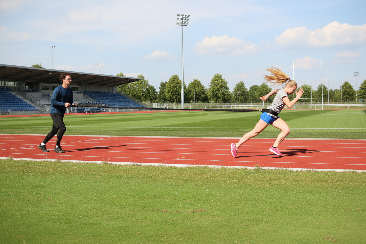 Elastic resistance trainer strap with waist belt. Part of the HAEST training device series for professioneal speed and strength training. While one athlete is providing the necessary amount of resistance through holding the resistance trainer handles, the second athlete exercises. The elastic tubes are protected by a synthetic covering. This is an important quality characteristic when it comes to resistance training devices. Cushioned waist belt. Foam-covered handles. A carry net is included in the delivery.