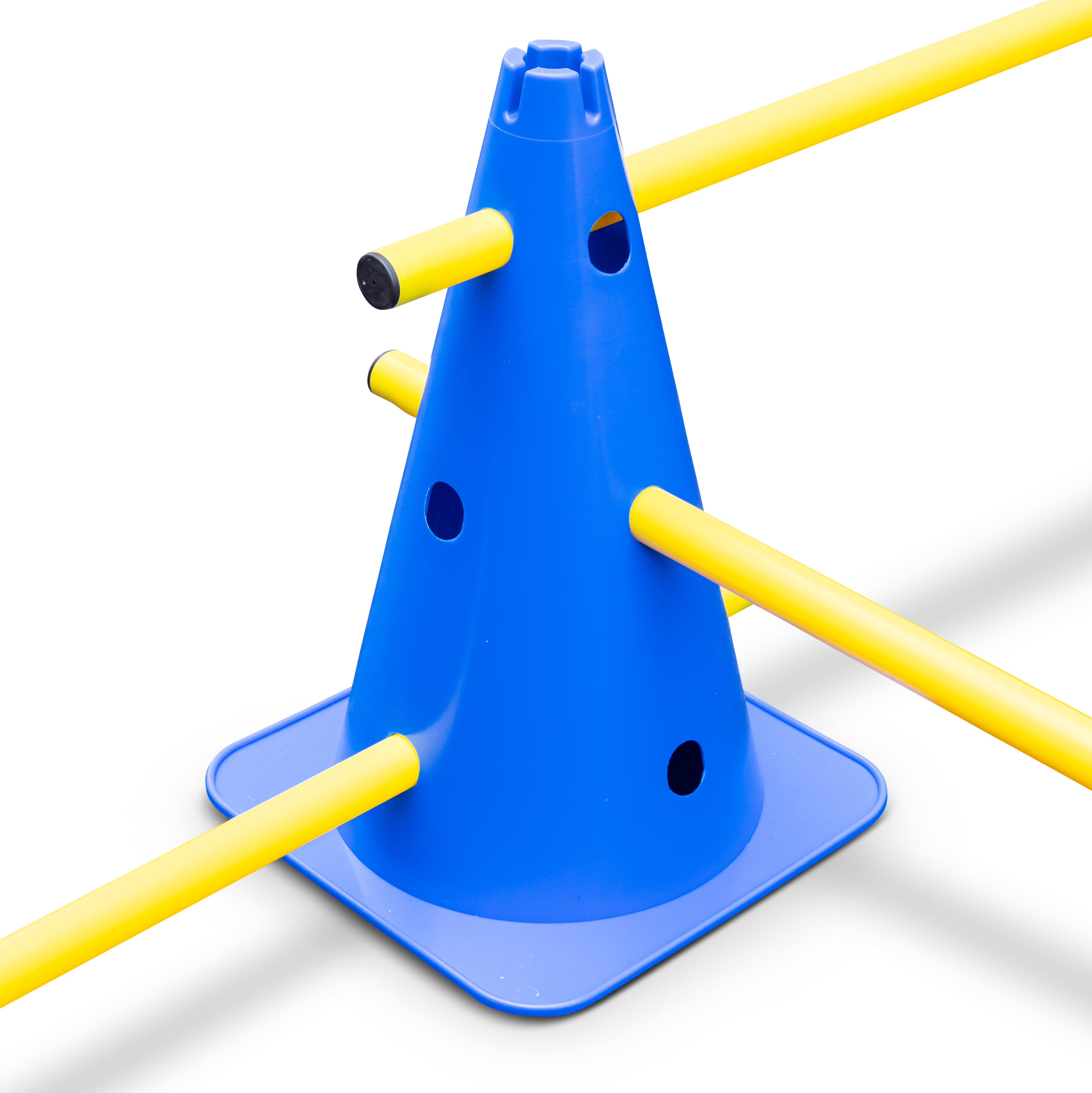 Each cone features four plug-in directions (12 openings in total), as well as a central receptacle for a vertical coordination pole. This allows for professional training setups, including: