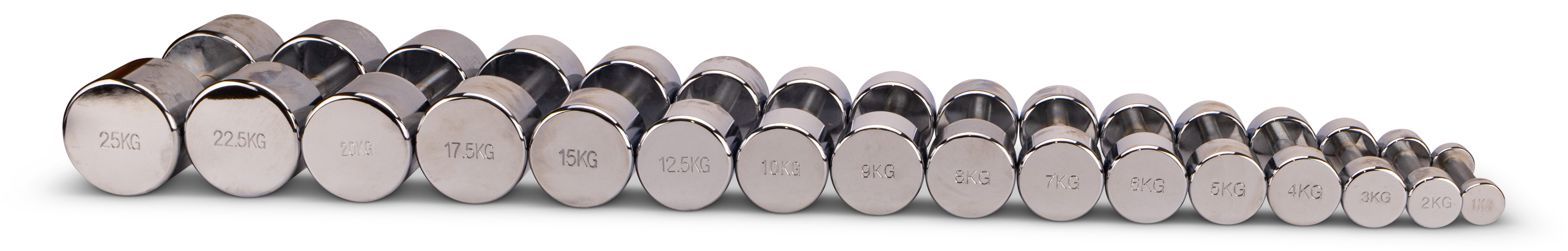Professional dumbbells for fitness and strength training. Attractive appearance due to chrome finish. The knurled handles provide good grip even during intense training sessions. Dumbbells up to 10 kg are delivered as a pair, anything heavier than that is sold as a single dumbbell.